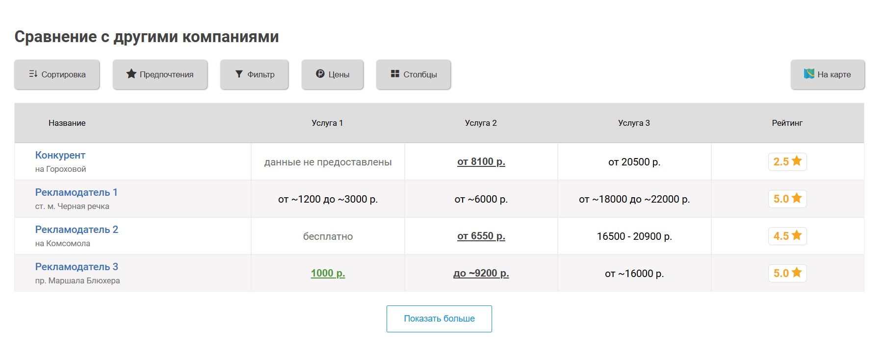 Все продвигаемые компании стоят перед непродвигаемыми. Чем выше тариф, тем выше позиция. Если тариф одинаковый, преимущество получает компания, которая продвигалась дольше. Это относится ко всем страницам портала — к главной странице, страницам по метро, по району, страницам по отдельным видам услуг и пр.