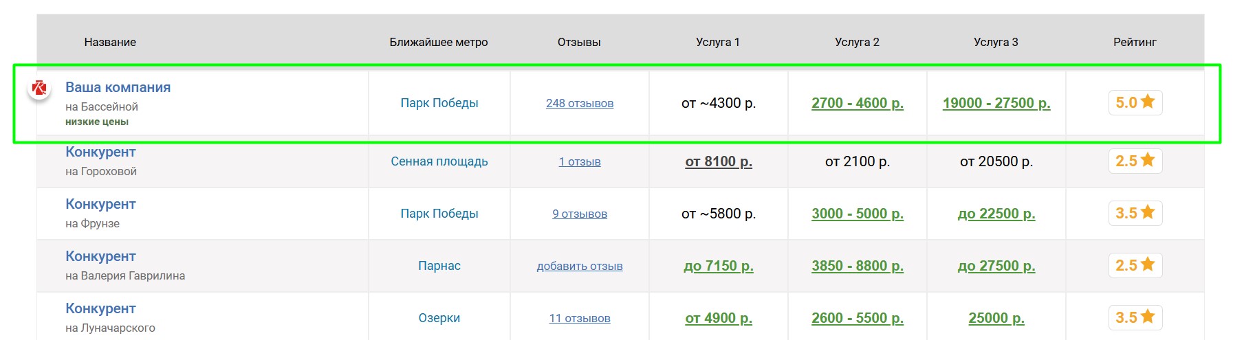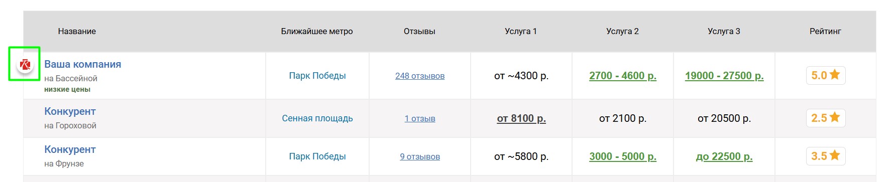Если низкие цены — ваше конкурентное преимущество, их можно выделить. Размещение цен ниже определённого лимита является платным: чем ниже цена, тем дороже размещение. Стоимость и лимит зависят от конкретной услуги.